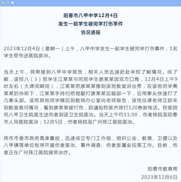 ·廣東陽春一中學(xué)生疑被同學(xué)打成植物人?官方通報:成立專門工作組。