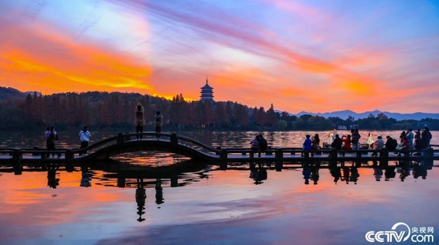 夕陽西下,在杭州西湖景區(qū),晚霞染紅了天空和水面,與遠處的雷峰塔構(gòu)成了一幅美麗的畫卷,吸引游客拍照打卡。