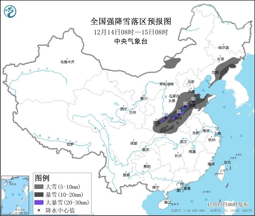 12月14日08時至12月15日08時,陜西東南部、湖北西北部、河南中西部和北部、山西南部、河北南部、山東大部、遼寧東部、吉林東部以及內蒙古中部等地的部分地區(qū)有大到暴雪,其中,陜西東南部、河南北部、山東西北部等地部分地區(qū)有大暴雪(20~30毫米)。上述部分地區(qū)新增積雪深度8~12厘米,局地可達15-20厘米以上。