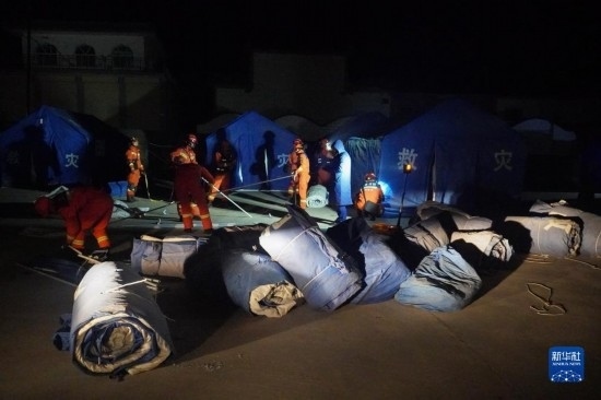 12月19日,在甘肅省臨夏回族自治州積石山保安族東鄉(xiāng)族撒拉族自治縣大河家鎮(zhèn)大河村,消防人員搭建救災帳篷。