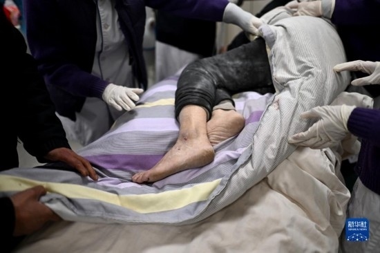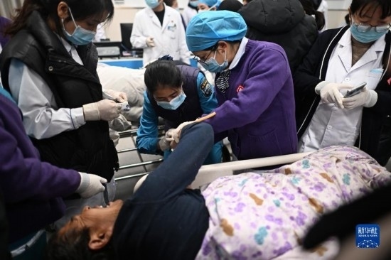 12月19日,在甘肅省臨夏回族自治州積石山縣人民醫(yī)院,地震傷員接受診療。