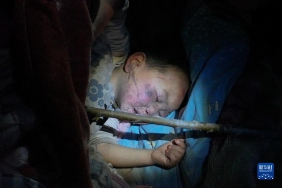 12月19日,在甘肅省臨夏回族自治州積石山保安族東鄉(xiāng)族撒拉族自治縣積石山縣中西醫(yī)結合醫(yī)院門口,一名受傷兒童得到安置和初步診療后熟睡。