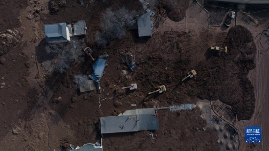 12月19日,救援機(jī)械和人員在青海省海東市民和回族土族自治縣中川鄉(xiāng)金田村清理地震引發(fā)的砂涌(無(wú)人機(jī)照片)。