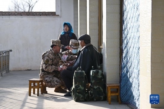12月19日,武警青??傟?duì)海東支隊(duì)衛(wèi)生隊(duì)醫(yī)師在青海省海東市民和回族土族自治縣中川鄉(xiāng)草灘村開(kāi)展醫(yī)療保障。