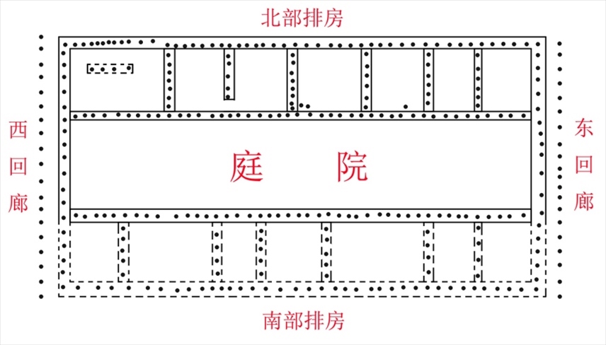“從柱洞的分布規(guī)律來看,這一夯土臺基整體應是南北為排房建筑、中部為庭院、東西帶回廊的結構,規(guī)模宏大,結構復雜?!惫懦钦z址發(fā)掘現(xiàn)場負責人李博說。