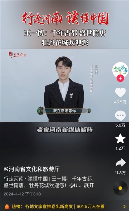 有人統(tǒng)計(jì),自1月9日起,河南文旅官方賬號(hào)“河南省文化和旅游廳”每天發(fā)布二三十條視頻,連續(xù)四天發(fā)布了112條視頻,持續(xù)展示本地文旅資源,吸引了近百萬(wàn)新粉絲,主打一個(gè)“量變總會(huì)引起質(zhì)變”,以至于“河南文旅到底發(fā)了多少抖音”相關(guān)話題成為熱門搜索。