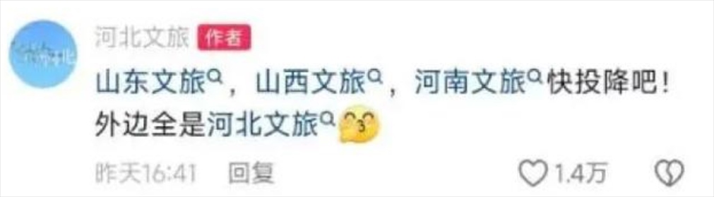 此前,山西、河南宣布結(jié)成“旅游搭子”,豫晉六城114家A級(jí)景區(qū)門票互免,見(jiàn)河南文旅“悄悄努力驚艷所有人”,山西文旅“醋壇子立馬打翻了”,直接喊麥……
