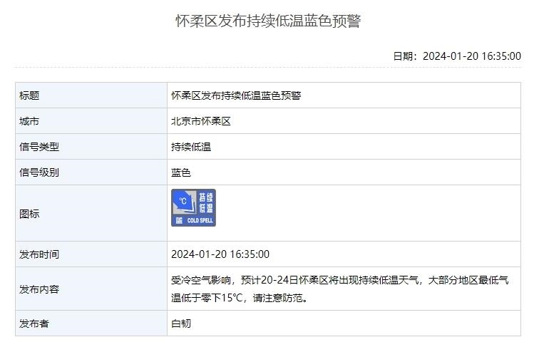 1月20日,北京延慶、懷柔、昌平3區(qū)發(fā)布持續(xù)低溫藍(lán)色預(yù)警。受冷空氣影響,預(yù)計(jì)20—24日這3個區(qū)將出現(xiàn)持續(xù)低溫天氣,其中延慶、懷柔兩地大部分地區(qū)氣溫低于零下15℃,請注意防范。