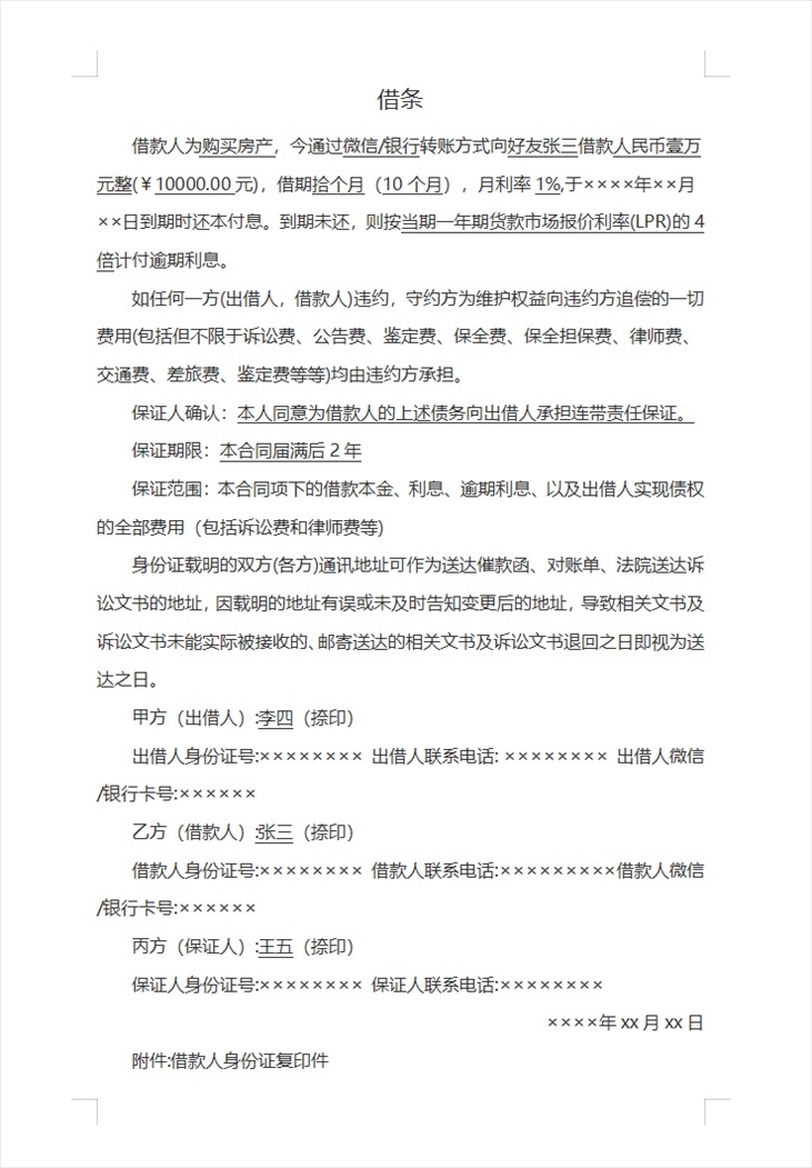 · 借款人:借款人應(yīng)當(dāng)在借條中簽名、捺印并附上身份證號碼。