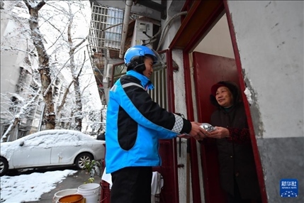 1月21日晚到22日晨,湖南長沙城區(qū)迎來2024年首場降雪。針對行動不便的高齡、失能、殘障等獨居老人,長沙市天心區(qū)裕南街街道聯(lián)合外賣騎手志愿者為老人免費送餐上門,解決獨居老人在低溫雨雪天氣時的就餐難題。