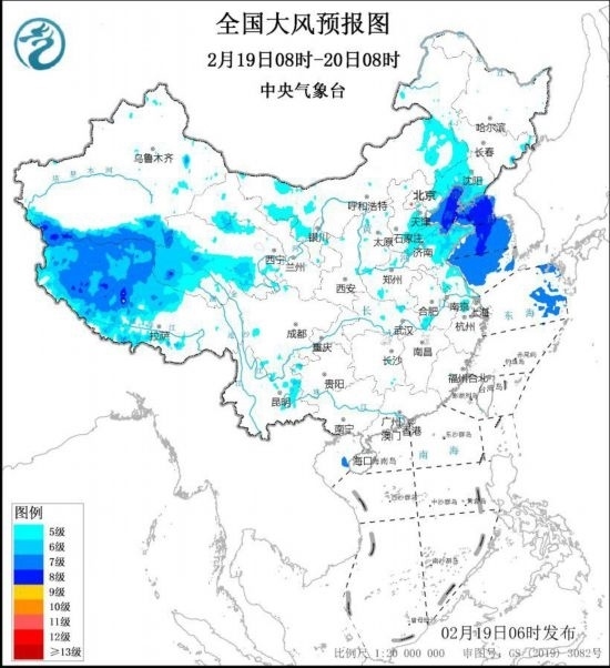 中央氣象臺2月19日6時繼續(xù)發(fā)布大風藍色預警:預計,2月19日8時至20日8時,西藏中西部、青海中南部、內(nèi)蒙古東南部、遼寧西部和南部、華北東部、黃淮東部、江淮東部等地的部分地區(qū)有5~6級風,陣風7~9級。渤海、渤海海峽、黃海大部海域?qū)⒂?~8級風,陣風9~10級。