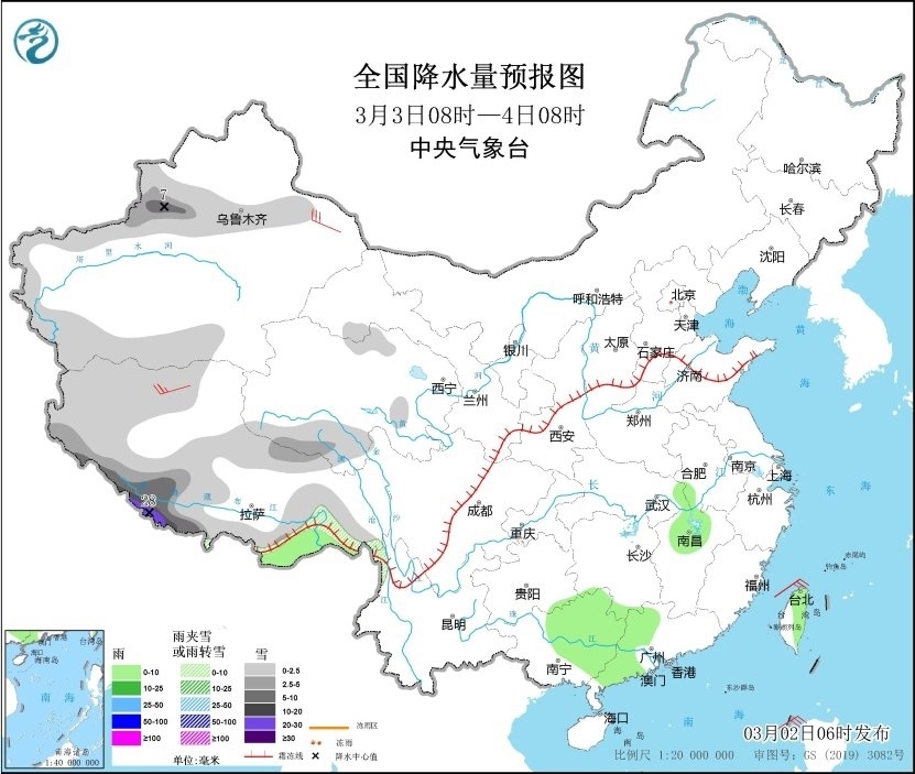 3月3日08時(shí)至4日08時(shí),新疆南疆西部山區(qū)、伊犁河谷和沿天山地區(qū)、西藏大部、青海南部等地部分地區(qū)有小到中雪或雨夾雪,其中,新疆伊犁河谷、西藏西南部等地部分地區(qū)有大到暴雪,局地大暴雪(20~28毫米)。西藏東南部、湖北東部、湖南南部、江西北部、廣西中東部、廣東中西部、臺(tái)灣島大部等地部分地區(qū)有小雨。新疆東部、西藏等地有4~6級(jí)風(fēng)(見圖2)。黃海南部、東海中北部、臺(tái)灣海峽、南海北部、北部灣等地有4~5級(jí)風(fēng),陣風(fēng)6級(jí)。