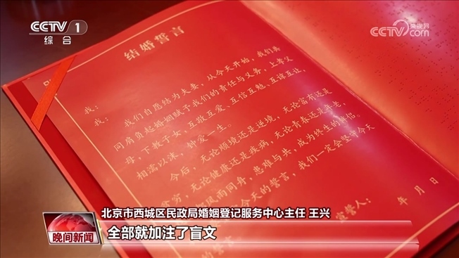北京市西城區(qū)民政局婚姻登記服務(wù)中心主任 王興:我們通過這次活動也是跟盲文出版社正式把這個(gè)結(jié)婚登記的告知單,還有結(jié)婚誓言,全部就加注了盲文,等以后再有相同需求的殘疾人到我們婚姻登記(服務(wù)中心)登記結(jié)婚,我們會給他們提供一套相應(yīng)的流程。