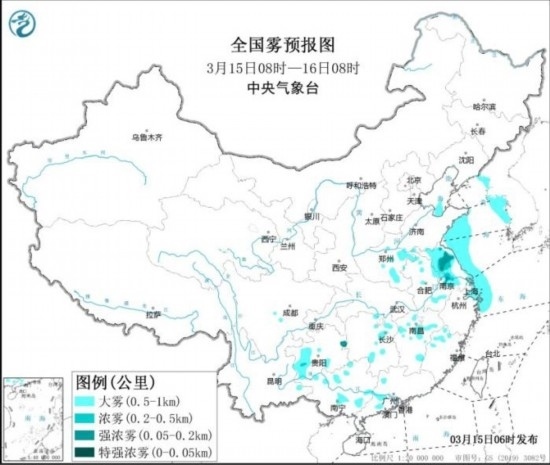 全國霧預報圖(3月15日08時-16日08時)。圖片來源:中央氣象臺網(wǎng)站
