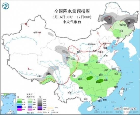 全國降水量預報圖(3月15日08時-16日08時)。圖片來源:中央氣象臺網(wǎng)站