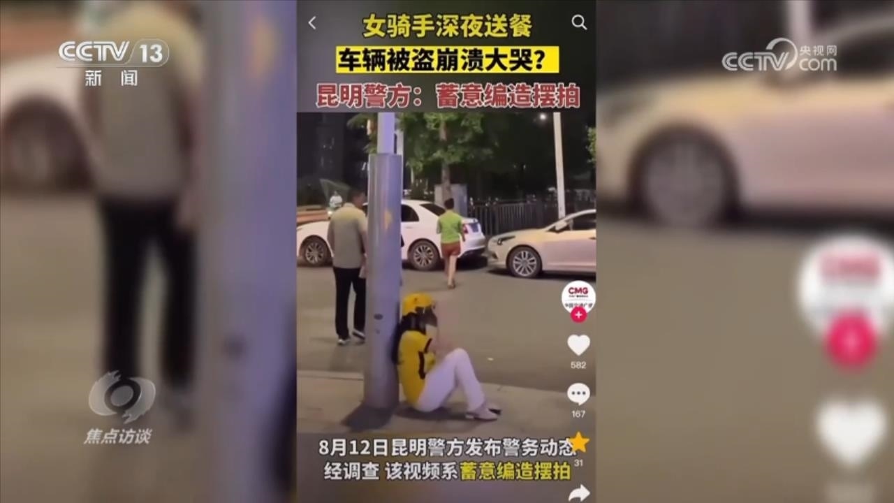 2023年8月3日,某網(wǎng)絡(luò)平臺(tái)發(fā)布了一個(gè)短視頻,除了哭泣聲,上面文字打的是“深夜,外賣(mài)姐姐送餐,下樓發(fā)現(xiàn)車(chē)被偷了”。然而,就是這樣一個(gè)時(shí)長(zhǎng)僅10秒左右的視頻,當(dāng)晚瀏覽量已超6000萬(wàn)次,并在多個(gè)平臺(tái)迅速傳播,進(jìn)入熱榜,隨即點(diǎn)贊、收藏量超過(guò)10萬(wàn)次。同樣,這些也引起了警方的關(guān)注,經(jīng)調(diào)查核實(shí),該視頻為擺拍,發(fā)布者就是畫(huà)面中表演的女子,其丈夫在旁負(fù)責(zé)道具和指導(dǎo)。而他們當(dāng)時(shí)擺拍的全過(guò)程被大街上的戶外監(jiān)控記錄了下來(lái)。