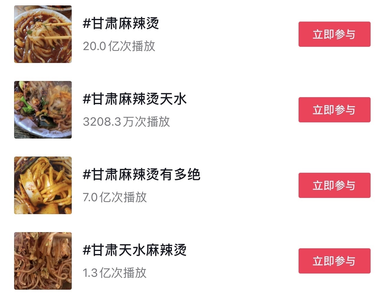 “這兩條視頻吸引了大量網(wǎng)民觀看、點(diǎn)贊、轉(zhuǎn)發(fā),之后陸續(xù)有網(wǎng)民發(fā)布相關(guān)視頻?!?月18日,甘肅省文化和旅游廳在回復(fù)網(wǎng)友建議中提到,3月份以來(lái),“甘肅麻辣燙”話題迅速發(fā)酵,視頻內(nèi)容迅速增加,多次登上抖音、快手等短視頻平臺(tái)熱榜。截至3月16日18:00,各大短視頻平臺(tái)上“甘肅麻辣燙”相關(guān)話題累計(jì)播放量已超過(guò)32.6億次。