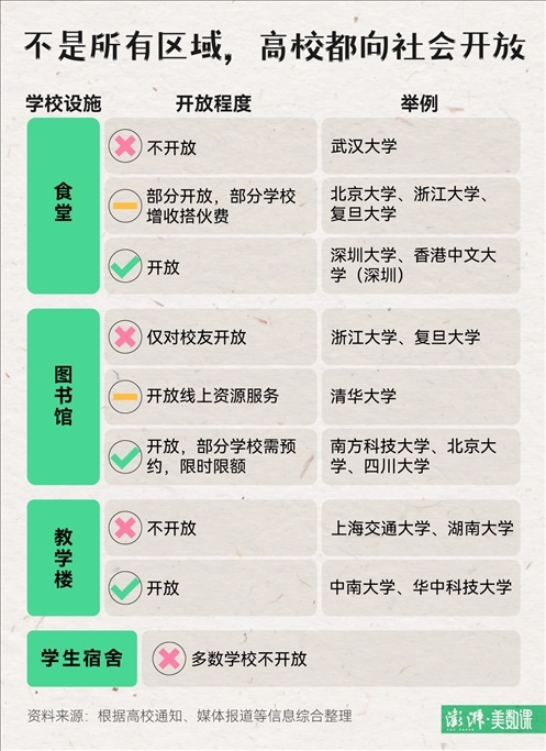 最令在校學(xué)生頭疼的要與游客爭搶學(xué)校資源的問題,例如食堂、圖書館和教學(xué)樓等,各個學(xué)校在決定開放校園的同時也給出了相關(guān)規(guī)定。