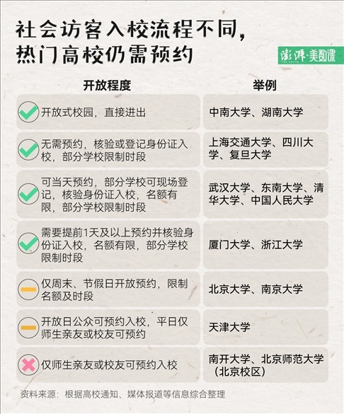 還有學(xué)校在訪客人數(shù)、開放時間上,做出了限制:清華大學(xué)工作日開放 2000 個名額,周末、節(jié)假日增加至 1.2 萬個;北大、南大等學(xué)校工作日不開放,學(xué)期內(nèi)僅周末和法定節(jié)假日開放。