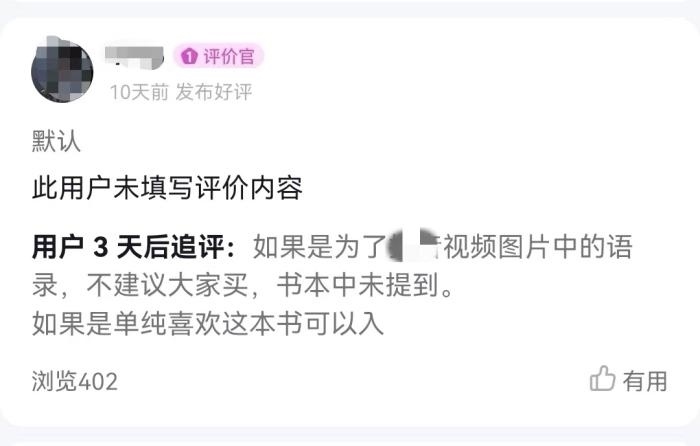 例如,在余華《我們生活在巨大的差距里》這本書的購買評論里,有人就提到,“如果是為了視頻圖片中的語錄,不建議大家購買,書本中未提到。”