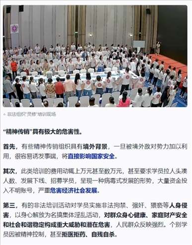 ·起底被公安機(jī)關(guān)打擊查處的“靈修”組織:打著“靈修”“靈魂塑造”等旗號,對學(xué)員實施精神控制;借“靈修”提升之名,行“精神傳銷”之實。鄧海鵬及其創(chuàng)辦的培訓(xùn)機(jī)構(gòu),打著“靈魂塑造”“集體場域”的幌子,對學(xué)員進(jìn)行精神控制,然后以傳銷、加盟、進(jìn)階等現(xiàn)代營銷模式達(dá)到斂財漁色目的。人前他要求學(xué)員全部吃素,自己每天大魚大肉,必吃海參;人前他要求學(xué)員不能有不動產(chǎn)、錢是修行來的,自己卻拿著騙來的錢去買理財產(chǎn)品;人前他無兒無女,實則有妻有女;人前假裝不近女色,背地里卻漁色女學(xué)員。