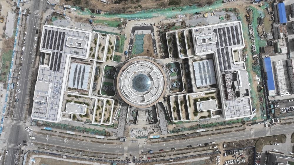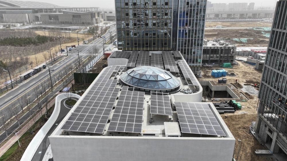 ↑雄安自貿(mào)試驗區(qū)交流展示中心是首批通過新區(qū)專家評審的零碳示范建筑,這是該中心屋頂?shù)墓夥l(fā)電設(shè)施(3月28日攝,無人機(jī)照片)。