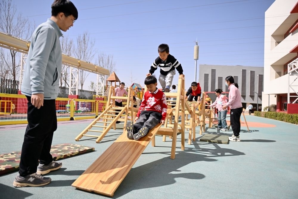 ↑3月29日,雄安北海幼兒園的孩子們在室外做游戲。