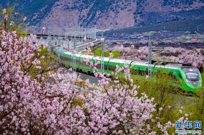 雪域高原桃花開,復(fù)興號(hào)上賞春光。拉林鐵路的車票,猶如一張賞花請(qǐng)柬,吸引了眾多游客前來雪域高原賞桃花。