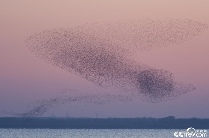 沈陽(yáng)康平縣臥龍湖生態(tài)區(qū)水域上空,數(shù)萬(wàn)只花臉鴨同時(shí)與夕陽(yáng)共舞,形成壯觀的“鳥浪”。