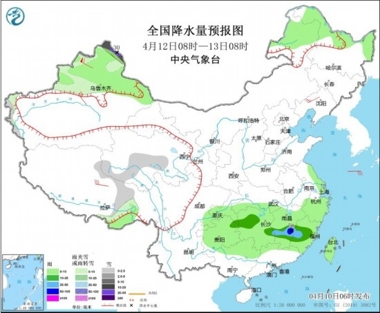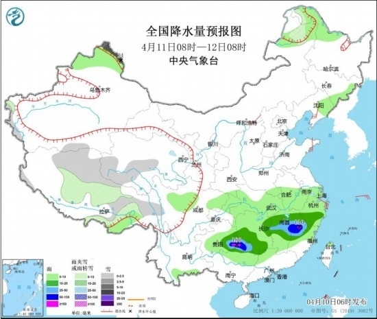 4月11日08時(shí)至12日08時(shí),內(nèi)蒙古東北部、西藏中東部、青海南部、新疆北疆北部等地部分地區(qū)有小到中雪或雨夾雪,其中,新疆北疆北部和北疆東部等地部分地區(qū)有大到暴雪,局地大暴雪(20~24毫米)。貴州東南部、湖南中南部、江西中北部、浙江南部、福建北部、廣西北部等地部分地區(qū)有中到大雨,其中,貴州東南部、湖南西南部、江西東部、福建西北部、廣西東北部等地部分地區(qū)有暴雨或大暴雨(100~180毫米)。內(nèi)蒙古中部、遼東半島、山東半島、浙江北部等地部分地區(qū)有4~5級(jí)風(fēng);渤海、渤海海峽、黃海大部海域部分海域?qū)⒂?~7級(jí)、陣風(fēng)8級(jí)的風(fēng)。