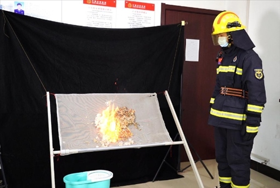 圖四:消防員在展示柳絮點燃實驗。(來源:新華社)