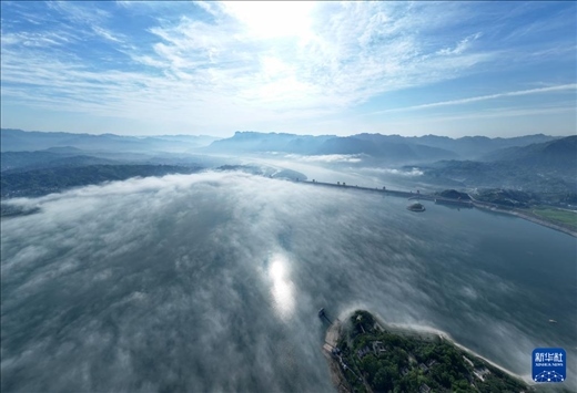 當(dāng)日,雨過(guò)天晴的三峽大壩及附近水域上空云霧繚繞,美景如畫。