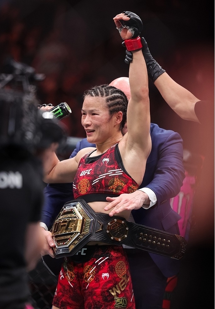 北京時(shí)間14日,UFC(終極格斗冠軍賽)史上首次“中國(guó)德比”冠軍戰(zhàn)在美國(guó)拉斯維加斯上演。兩位選手?jǐn)y手奉獻(xiàn)了一場(chǎng)精彩的比賽,經(jīng)過五回合鏖戰(zhàn),張偉麗戰(zhàn)勝閆曉楠,成功衛(wèi)冕女子草量級(jí)金腰帶。