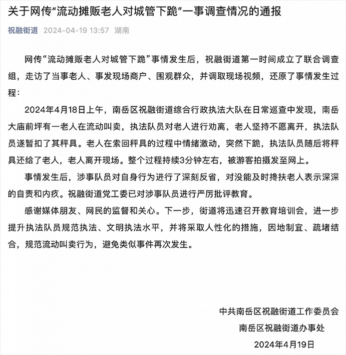 央視網(wǎng)消息:4月19日,衡陽南岳區(qū)祝融街道辦事處發(fā)布關(guān)于網(wǎng)傳“流動(dòng)攤販老人對(duì)城管下跪”一事調(diào)查情況的通報(bào)。