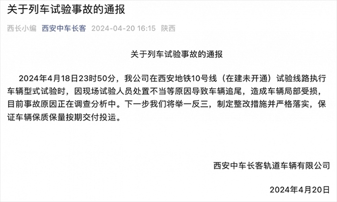 央視網(wǎng)消息:據(jù)西安中車長(zhǎng)客官微消息,西安中車長(zhǎng)客軌道車輛有限公司4月20日通報(bào),4月18日23時(shí)50分,公司在西安地鐵10號(hào)線(在建未開(kāi)通)試驗(yàn)線路執(zhí)行車輛型式試驗(yàn)時(shí),因現(xiàn)場(chǎng)試驗(yàn)人員處置不當(dāng)?shù)仍驅(qū)е萝囕v追尾,造成車輛局部受損,目前事故原因正在調(diào)查分析中。下一步將舉一反三,制定整改措施并嚴(yán)格落實(shí),保證車輛保質(zhì)保量按期交付投運(yùn)。