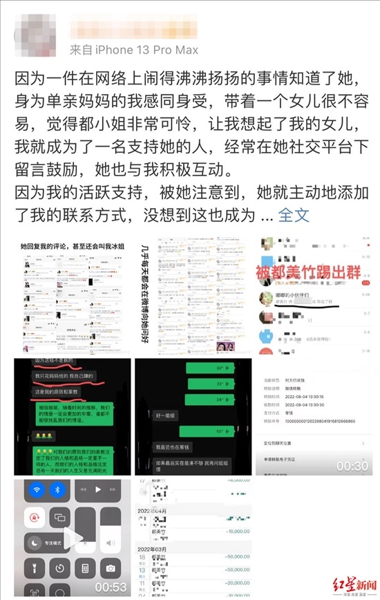 4月15日,都美竹粉絲朱姐發(fā)文稱,她先后給都美竹轉款近20萬元,現(xiàn)在認為都美竹“賣慘”騙錢。她希望都美竹還錢,但對方只給她轉了3萬元。