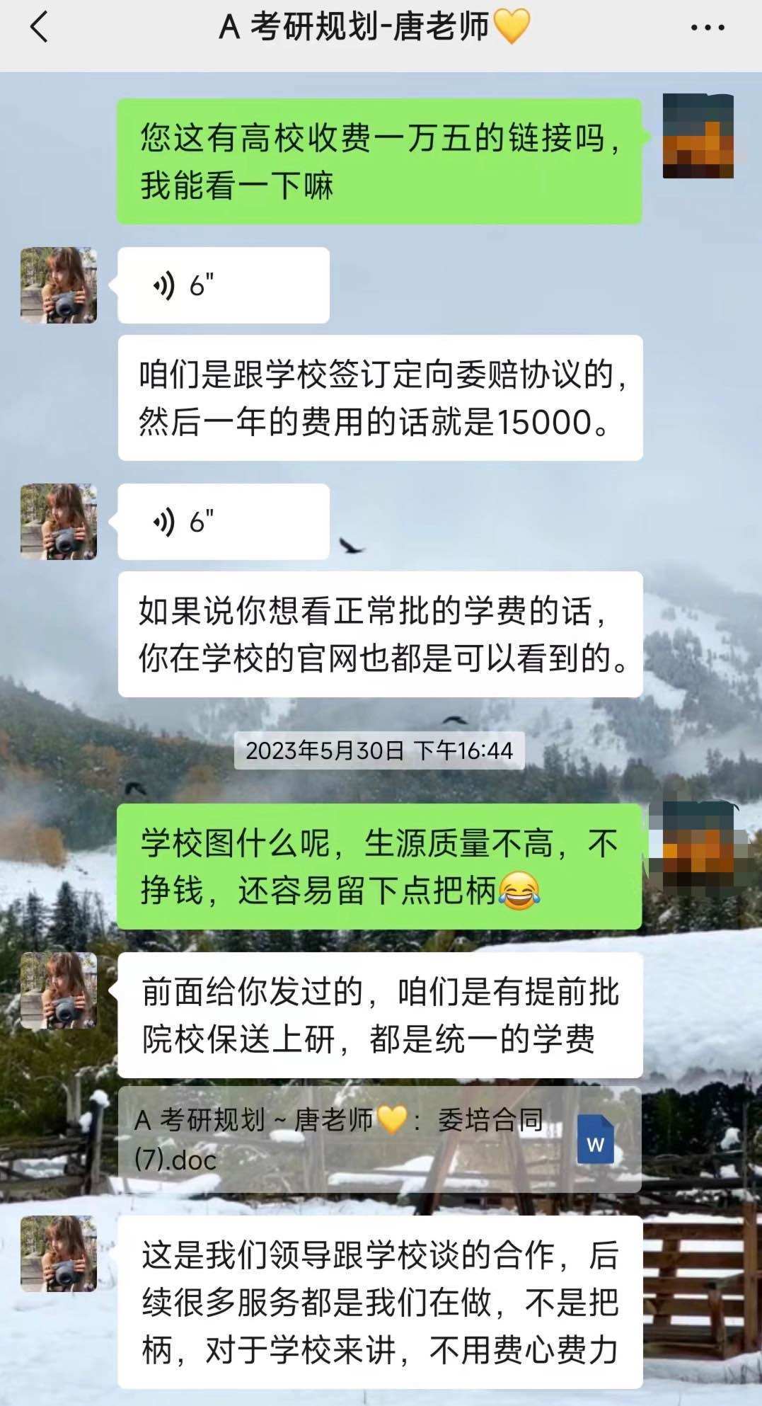 來自北京的陳鑫(化名)說,他被上述話術(shù)吸引,去年5月報了廣州研才教育機(jī)構(gòu)的“院校推免保送研究生課程”。咨詢時,招生老師向他承諾“渠道直錄,考研保過”,并稱還能通過“院校委培”的方式,幫他把20萬元左右的MBA學(xué)費降為1.5萬元。