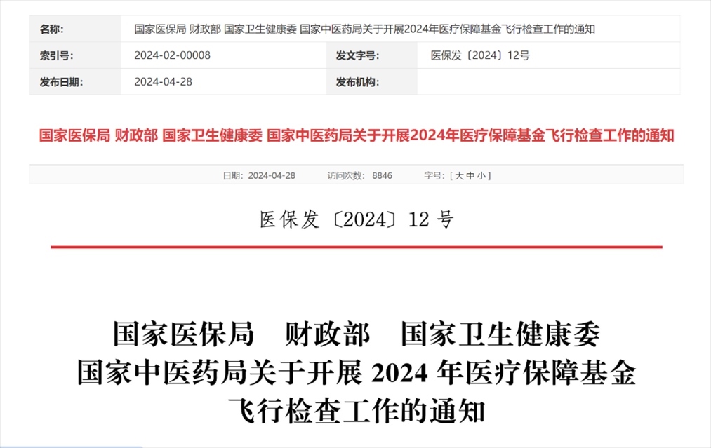 這項(xiàng)《關(guān)于開展2024年醫(yī)療保障基金飛行檢查工作的通知》由國家醫(yī)保局、財(cái)政部、國家衛(wèi)生健康委、國家中醫(yī)藥局聯(lián)合印發(fā)。
