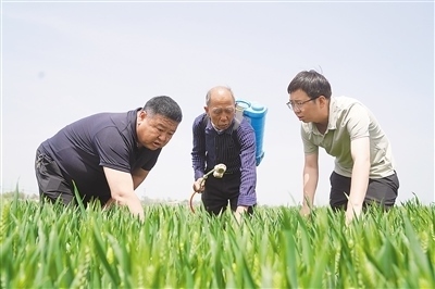 蘇丹(中)在指導村民進行小麥揚花期田間管理。本報記者 原韜雄攝
