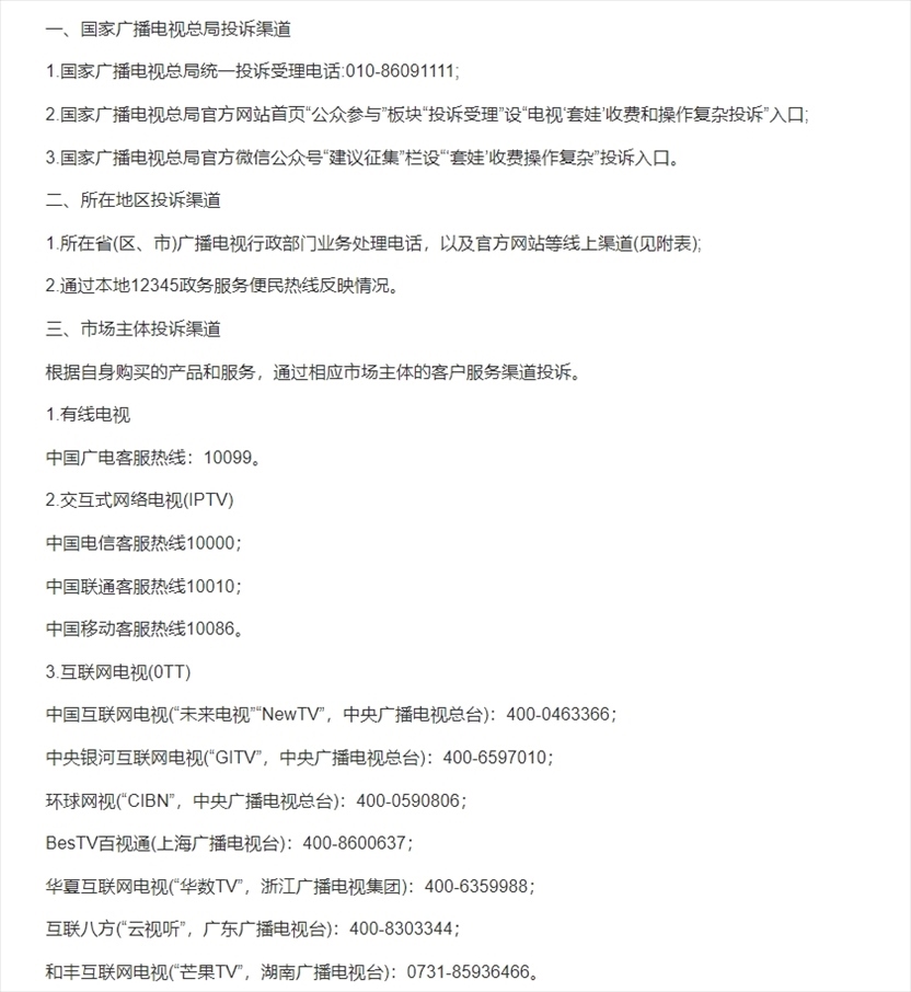 ·治理電視“套娃”收費(fèi)和操作復(fù)雜工作投訴渠道公布。