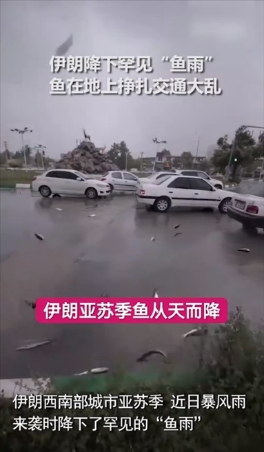 ·近日,伊朗亞蘇季市暴風(fēng)雨來襲時(shí),天空降下罕見“魚雨”。