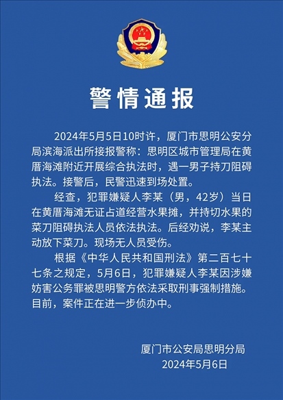 ·廈門警方:無證占道經(jīng)營(yíng)還持刀阻礙執(zhí)法,一男子被采取刑事強(qiáng)制措施。