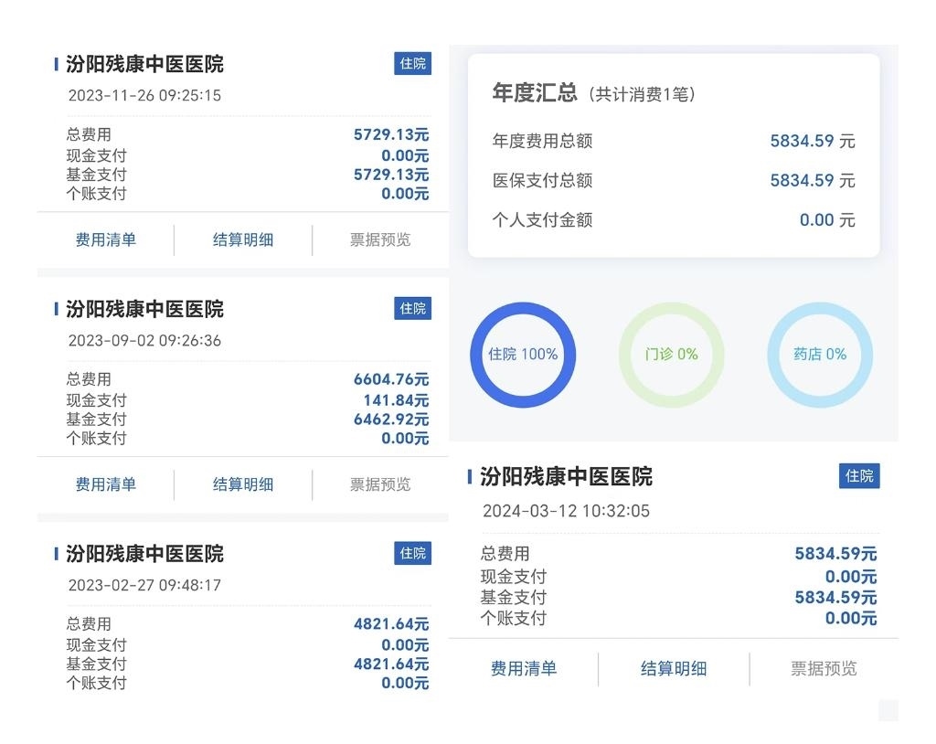 上圖是在國(guó)家醫(yī)保報(bào)銷(xiāo)平臺(tái)上查詢(xún)到的某位五保老人在殘康中醫(yī)醫(yī)院的醫(yī)保報(bào)銷(xiāo)記錄,2023年住院3次,2024年春季住院1次。(拼板照片)新華社發(fā)(楊哲攝)
