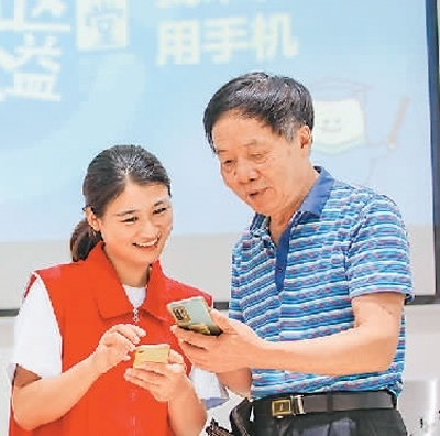 志愿者在福建省福州市鼓樓區(qū)安泰街道于山社區(qū)教老人使用智能手機(jī)。謝貴明攝(人民視覺(jué))