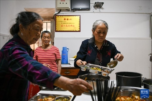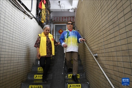 4月15日,馮懿蘋(右)與成都視障者互助協(xié)會家屬志愿者為樂隊(duì)成員準(zhǔn)備午飯。新華社記者 胥冰潔 攝