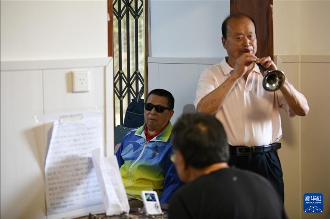 5月6日,張世維(后左)旁聽“自強(qiáng)不息藝術(shù)團(tuán)盲人樂隊(duì)”排練曲目。新華社記者 胥冰潔 攝