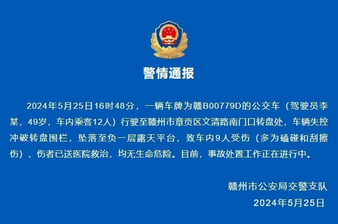 央視網(wǎng)消息:據(jù)贛州公安微信公眾號消息,2024年5月25日16時(shí)48分,一輛車牌為贛B00779D的公交車(駕駛員李某,49歲,車內(nèi)乘客12人)行駛至贛州市章貢區(qū)文清路南門口轉(zhuǎn)盤處,車輛失控沖破轉(zhuǎn)盤圍欄,墜落至負(fù)一層露天平臺,致車內(nèi)9人受傷(多為磕碰和刮擦傷),傷者已送醫(yī)院救治,均無生命危險(xiǎn)。目前,事故處置工作正在進(jìn)行中。