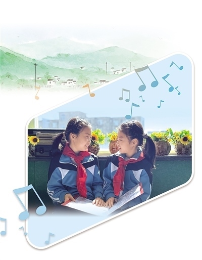 講臺上,隨著廖光新的雙手向前一打開,學生們齊刷刷地唱了起來。“今天天氣好,去找嘎嘎(外婆)嘍……”稚嫩而清脆的聲音瞬間充滿整個教室,透過窗戶傳向遠處的大山。