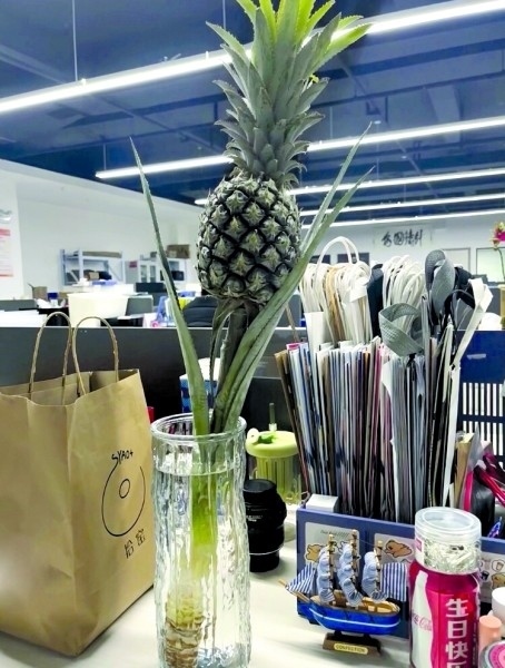 00后楊三日從事新媒體運營工作,她在工位上養(yǎng)了一個菠蘿,“養(yǎng)菠蘿是一件很酷的事情,不僅能觀賞,還能吃,很配我特立獨行的氣質。”她說自從養(yǎng)了菠蘿之后,每天上班時心情就變得非常好?!拔业墓の痪拖駸釒в炅忠粯樱崆斑M入了春天。”