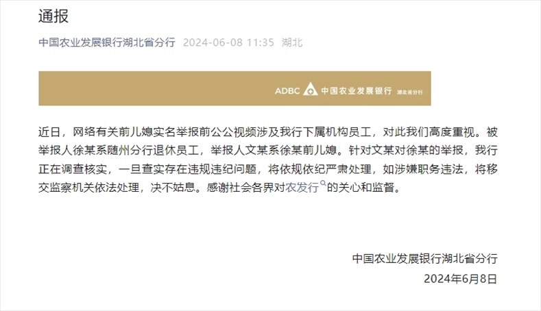 ·農(nóng)發(fā)行湖北分行通報“女子實名舉報前公公”:正調查核實。